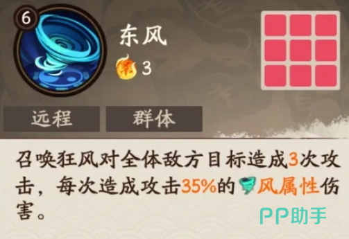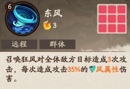 而他在必杀技效果当中是可以造成一个群体伤害的,九宫格当中基本都是可以受到他这里带来的多段伤害输出效果,使用这个必杀技东风的时候,他可以对敌方全体的单位都造成3次连击,每一次的攻击效果当中,都有35%的风属性伤害,那么在这里的话,大家就要注意他的天赋一般跟必杀技也是可以契合在一起使用,想要让他打出更高的伤害,那就前期要用天赋把他的看破快速的叠加起来,而且他在二命的情况下,就可以启用这里的看破状态叠加,在满命的情况下,他打出来的每一次输出,都基本能够达到115%的伤害,那么后期在释放了足够多的追加次数之后,合在一起一次就是230%的伤害,所以放在这里,他也绝对是一个谋士类型武将当中比较强势的角色了。