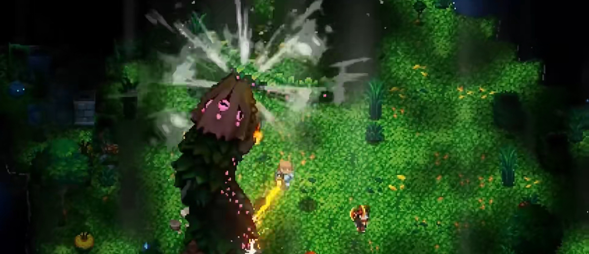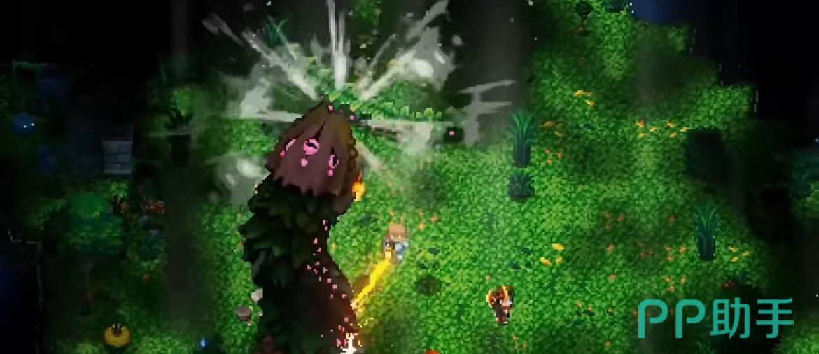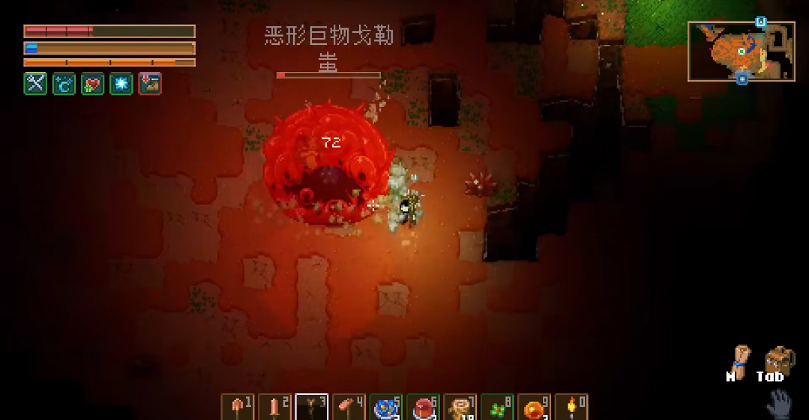 对于刚入坑的萌新们来说,资源收集是重中之重,探索完初始区域之后我们就可以来到三座神秘雕像跟前,根据它们的指引来到第一个boss的挑战处。第一个boss的形象是一只巨大的史莱姆,它们看起来软绵绵的没有攻击力,而且作为新手期的boss它的挑战难度并没有很高,只要装备武器稍微成型就可以轻松打败。击败它之后可以拿到蓝色宝石和油桶,油桶可以召唤出第一个npc,而宝石可以激活雕像,给我们更好的装备和全新的boss雷达。