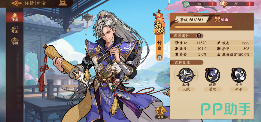 钟会目前在自身的效果当中带来的全部实力效果,都是需要通过权的状态来进行叠加,他的这个状态需要叠加的时候就要注意,前期只有经过一定的积累,后期才可以用到消耗权层数的大招,而且在这里他一般情况下只能针对敌方的前排角色进行伤害,消耗的层数越多的情况下伤害带来的数值就越高,所以前期如果想要快速叠加全的话,他的天赋能力大家就要注重一些,受到敌方攻击的话,他也可以叠加更多权的承受效果,钟会在天赋能力效果当中每一权在叠加到达自身身伤效果之后,都可以带来5%的暴击概率加成,最多的情况下是可以叠加到10层的,而且在他的星级提升之后,后期消耗5层以上权在用到必杀技的时候,还可以无视敌方身上的防御效果来对敌人进行攻击,所以如果敌方的前排防御是比较高的情况下,大家想要破防以及破坏对面的护甲,这里大家就可以用钟会来进行优先输出。