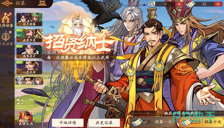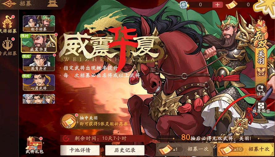 如果大家想要参与游戏当中80抽的卡池,建议大家去玩儿的就是常驻招募,常驻招募在游戏当中是属于一个长期都在的抽卡玩法,其中玩家可以使用游园套圈劵来进行招募,每10次招募就会获得至少一名名将,或者是以一名名将以上品质的武将,最多招募80次的时候,就可以获得一位无双武将,这也是游戏当中基础的保底了,所以在可能获得的无双品质当中,大家记得要在比较强势的武将当中选择,而另外除了基础的新手卡池当中是30抽保底之外,其他的卡池基本都是80抽保底的,这里还有威震华夏这个卡池,大家在其中同样也是可以拿到80抽的保底,大家可以在这里使用灵驼祈愿券来进行招募,每10次招募的话,就会获取到至少一名的名将或者是以上武将,当然在这个卡池当中也会出现一个up武将,也就是关羽,在其中使用灵驼祈愿建招募的时候,累计达到20次,是10次之后大家都会奖励更多的杀币,而且获得关羽之后,大家也可以奖励更多的抽卡劵,而关羽在升级之后,在这里大家同样也可以通过养成任务拿到更多的抽劵资源。