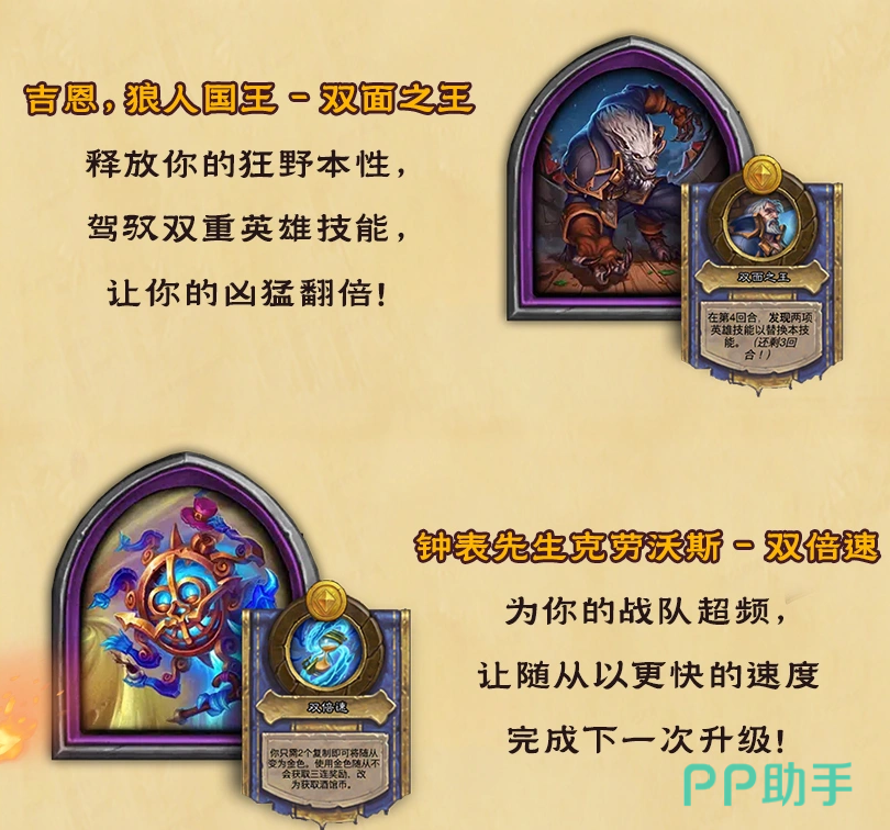 新英雄方面,吉恩·狼人国王的设计很有意思。他有双重英雄技能,可以在人形态和狼人形态之间切换,第4回合开始就能使用这个能力。另一个新英雄是钟表先生克劳沃斯,他的技能可以让随从更快完成升级,相当于给战队加速,能提前达到主要的星级节点。