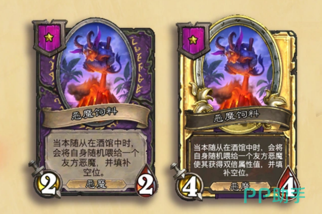恶魔种族,这次获得了一个叫"饲料"的新关键词。这个机制的运作方式比较特别,带有饲料标记的随从,会进入专属的随从池。当你刷新酒馆的时候,如果出现了饲料随从,场上饥饿的恶魔,就会直接把它吃掉,然后获得那个随从的全部属性,酒馆的位置,会重新刷出别的随从。这个机制让恶魔流派的成长速度变快了,前期可以通过不断刷新,来喂养核心恶魔,让它们的身材快速膨胀。不过要注意的是,饲料随从被吃掉后就没了,所以要算好时机,别浪费了主要的饲料卡。