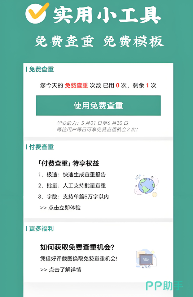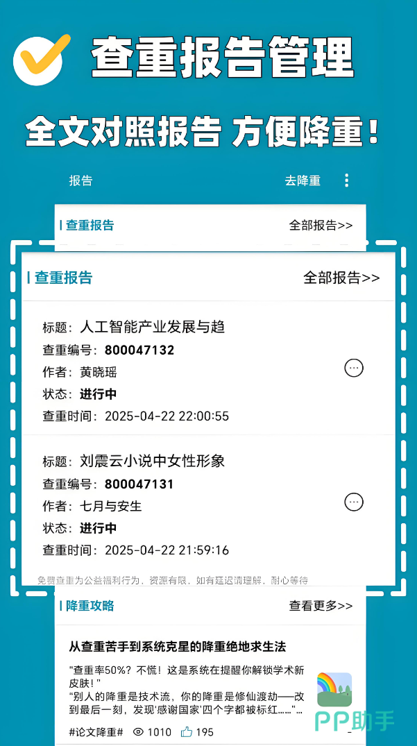 中国知网官方推出的移动端学术服务平台,查重引擎与高校及科研机构采购的检测系统同源,数据库总量逾两亿条,其中收录中文核心期刊超7900种,涵盖CNKI全部合作出版单位资源;检测结果具有高度一致性与权威背书,是学位论文预审与学术自查的重要参考依据。