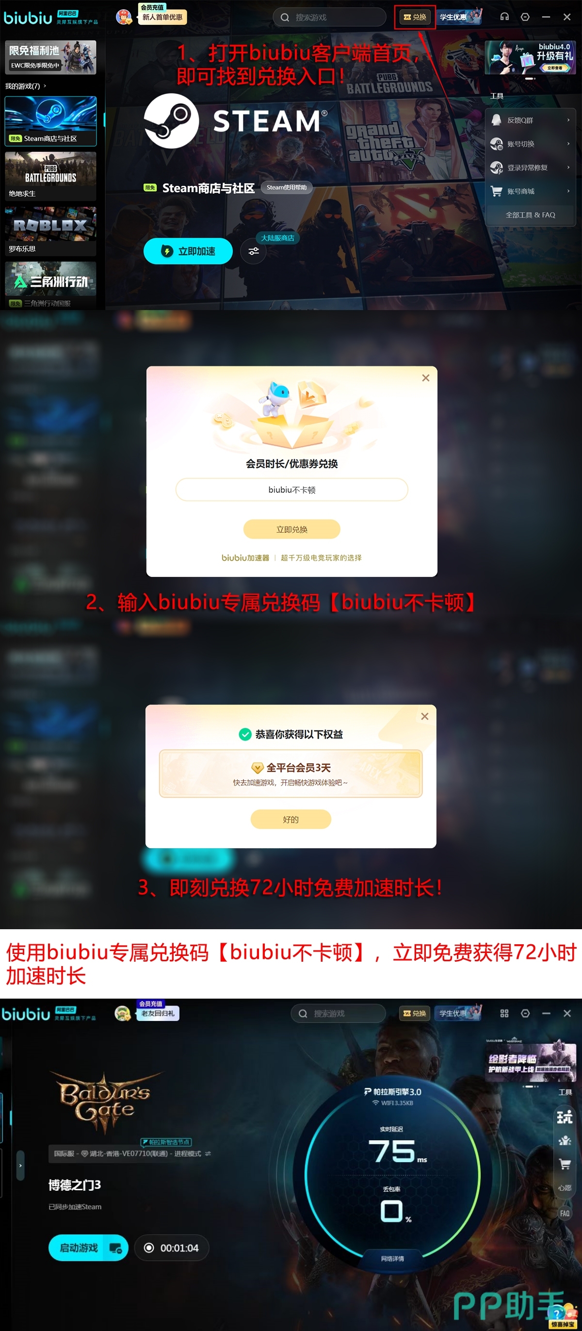目前新用户注册即可获赠24小时免费加速时长;所有用户输入兑换码【biubiu不卡顿】,均可额外领取3天加速权益。两项福利支持叠加,新用户最高可享总计96小时的无门槛加速服务,覆盖完整开荒周期与关键剧情推进阶段。
