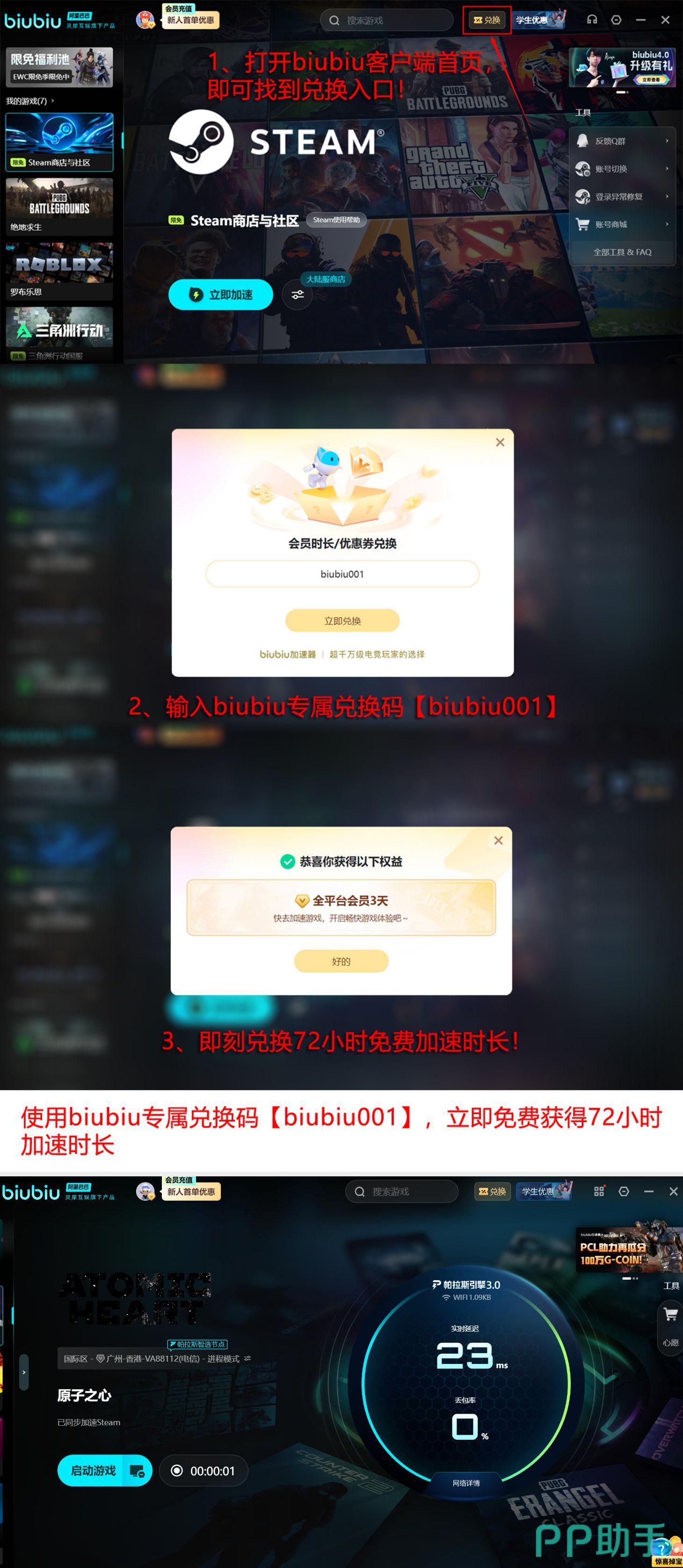 作为PUBG职业选手小叮当长期使用的指定加速方案,同时也是Pero战队官方训练与赛事备战标准工具,biubiu加速器已在高强度对抗类游戏中完成多轮实战验证。针对新老用户,平台开放专属兑换码【biubiu001】,可即时兑换三天免费加速时长;新用户完成注册后额外获赠24小时体验权益,叠加使用最高可达96小时无门槛加速服务。
