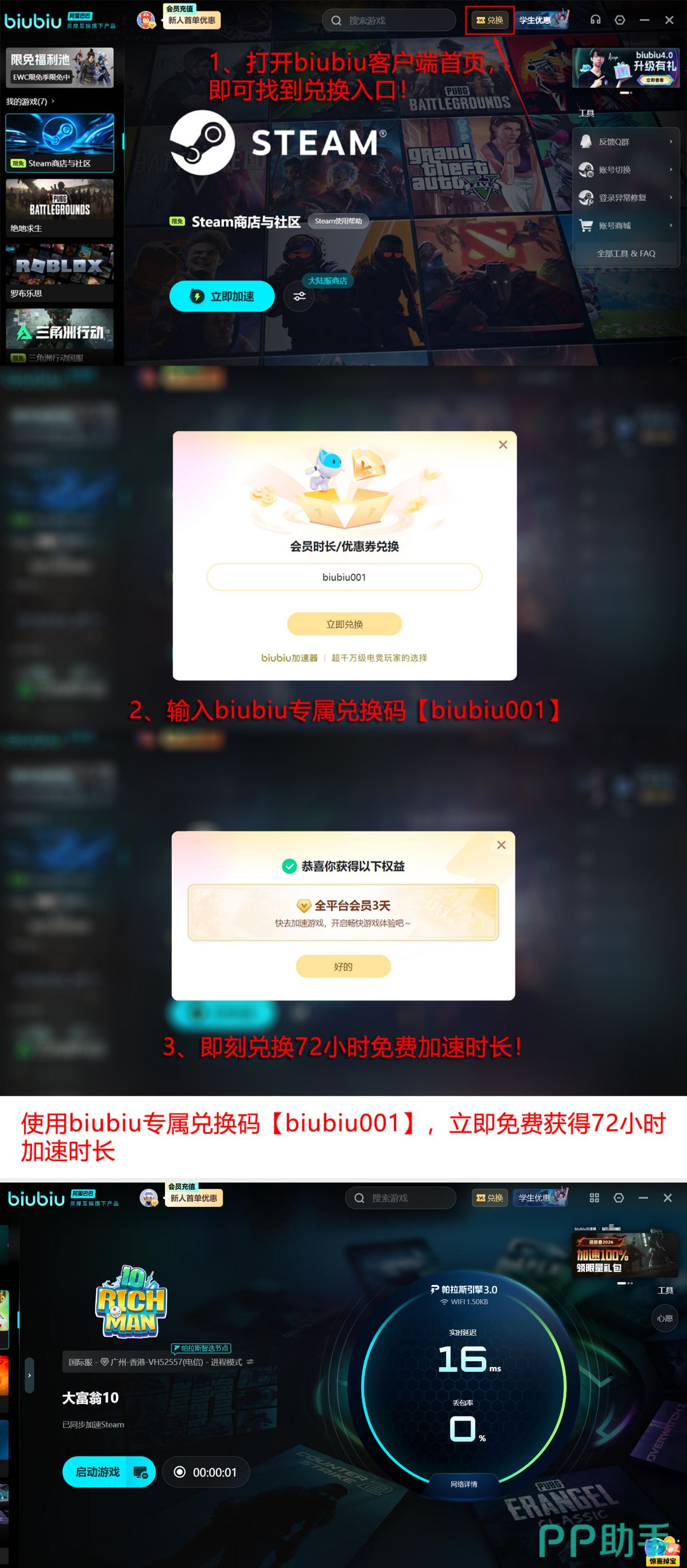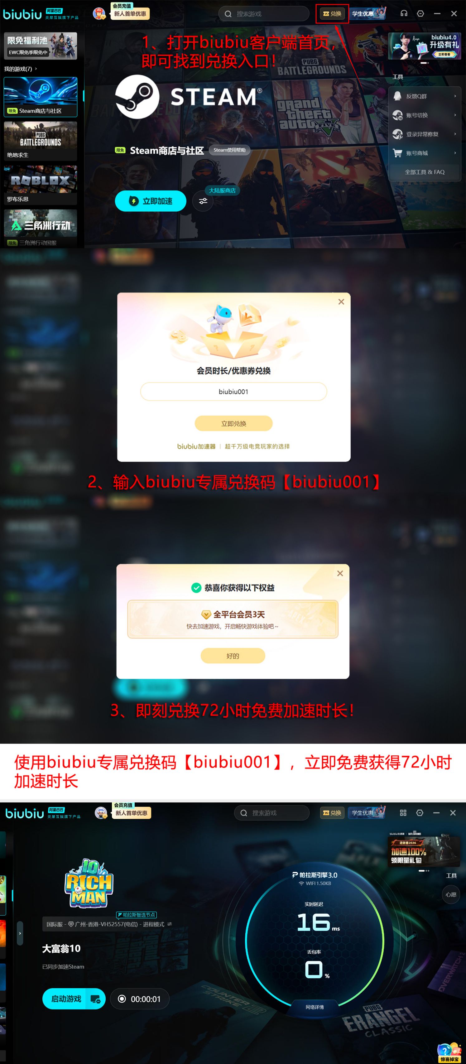 当前新用户注册即可获赠24小时免费加速权益;叠加通用兑换码biubiu001,还可额外领取3天时长。两项福利叠加后,总计可享96小时无门槛加速服务,全程无需付费,高效应对加载失败问题。