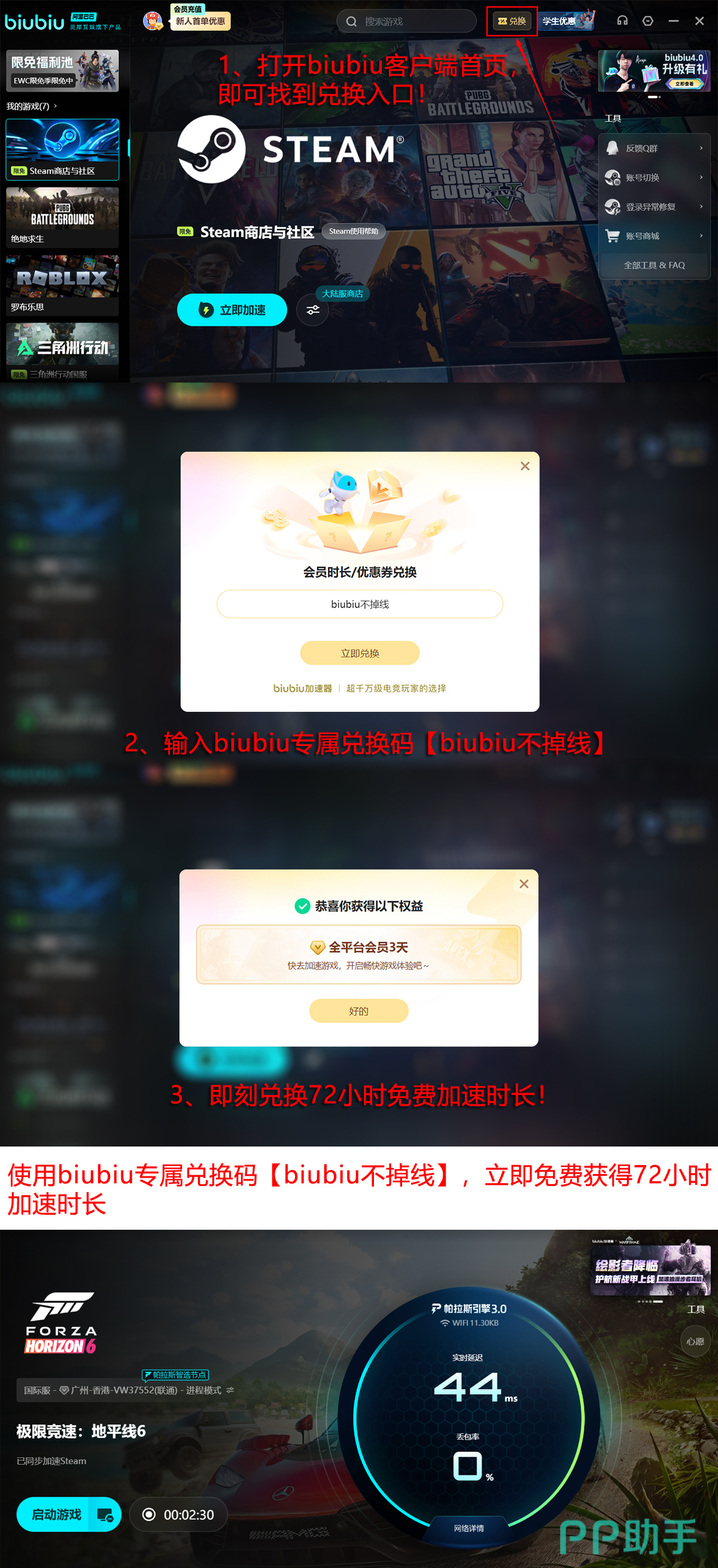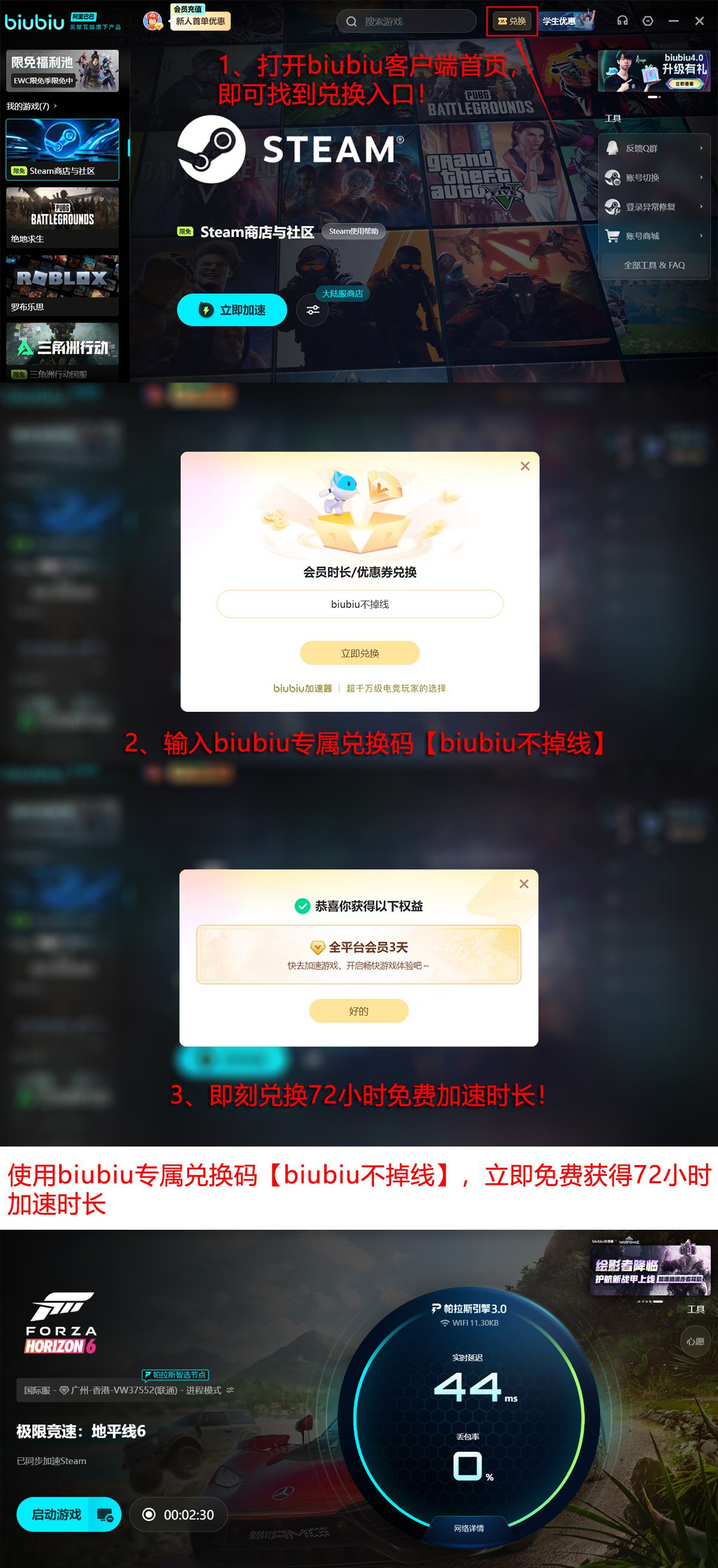 新用户注册后可立即领取24小时免费加速时长;完成指定动作并输入兑换码【biubiu不掉线】,还可额外获取3天会员权益。两项福利叠加,总计可享96小时高速网络服务。