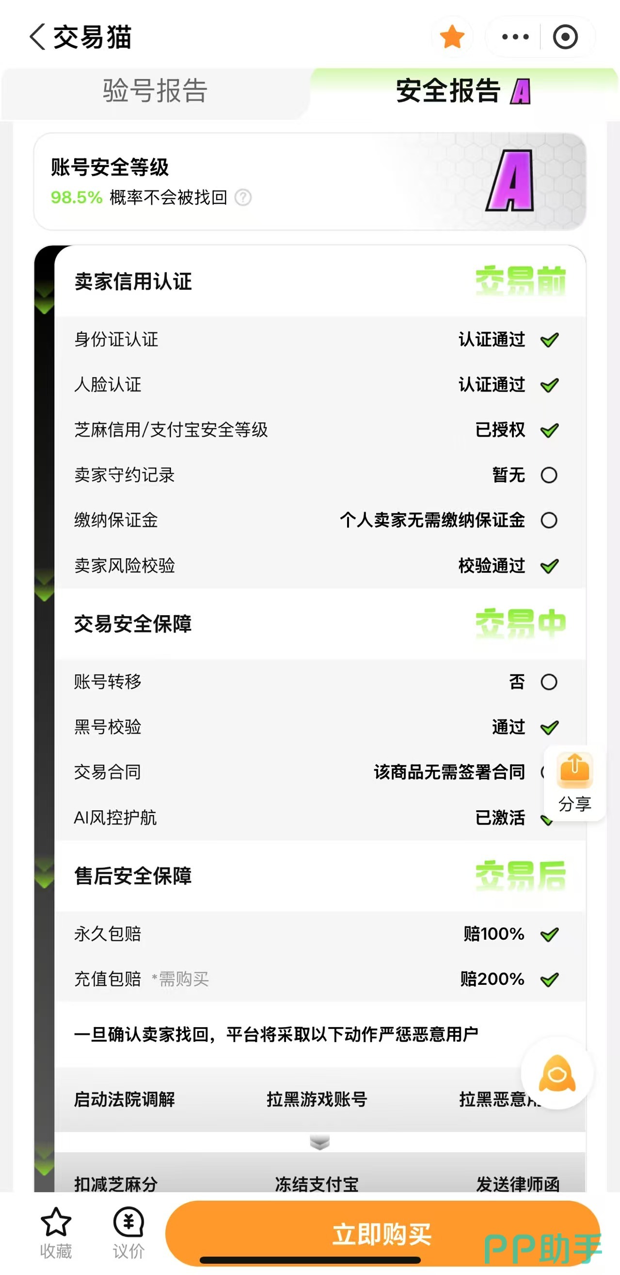 所有上架账号均须通过平台四级人工+AI联合验号流程:卖家需完成真实身份核验与信用评估;验号团队对账号绑定状态、角色等级、关键道具、成就进度、登录设备记录等进行逐项核查,并生成结构化验号报告,确保账号可换绑、无异常封禁风险、资产权属清晰。