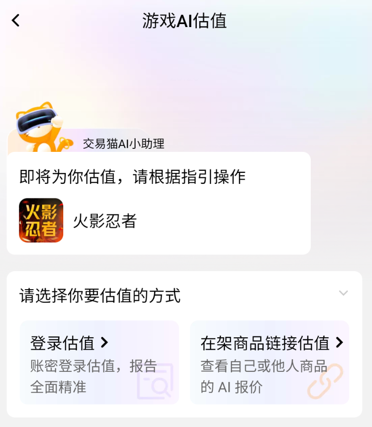 依托阿里巴巴灵犀互娱技术底座,交易猫整合九游、交易猫、biubiu加速器三大产品数据模型,构建火影忍者专属AI估值系统。支持两种估值模式:登录账号后自动读取全服数据生成“实时估值”,或输入商品链接获取“市场比价估值”,误差率低于6.2%,覆盖等级、忍者稀有度、装备词条、活动参与度等19类定价因子。