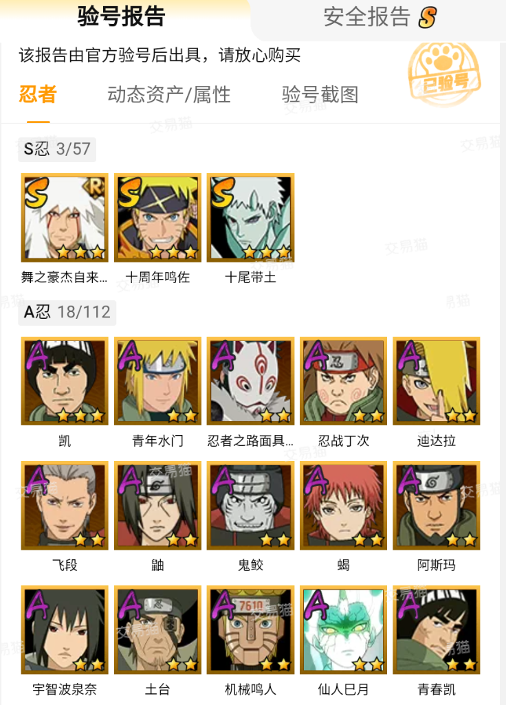 针对火影忍者手游,交易猫提供官方验号服务:报告包含账号等级(最高90级)、忍者图鉴完成率、S级忍者持有数(含宇智波鼬、漩涡鸣人、宇智波佐助等限定角色)、通灵兽星级(最高5星)、密卷配置、金币与勾玉存量、公会战历史战绩等27项核心数据。买家可据此快速判断账号是否匹配自身PK风格或战力规划目标。