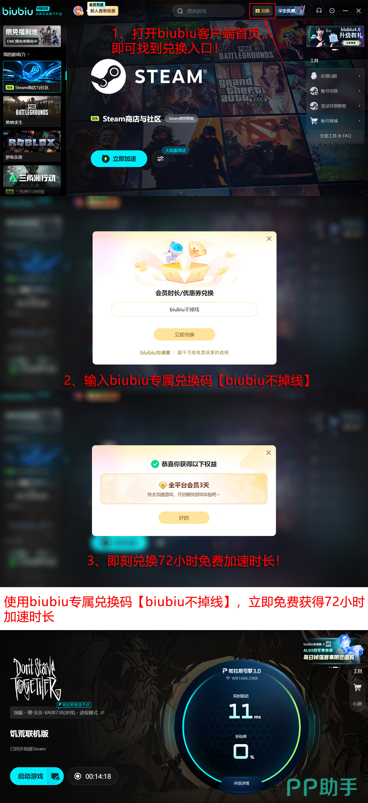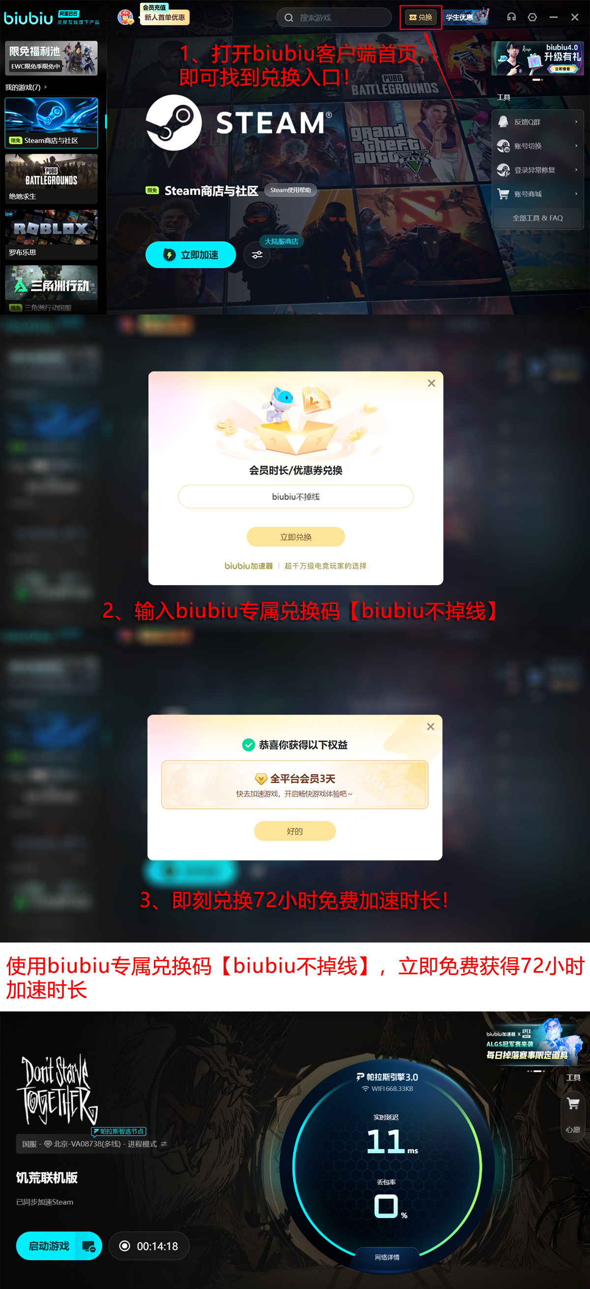 新用户专享福利同步上线:完成注册登录即可领取24小时免费加速时长;参与活动并输入兑换码【biubiu不掉线】,还可额外获取72小时服务权益。两项福利叠加,新人最高可享96小时连续加速体验,充分覆盖版本更新初期的深度体验周期。