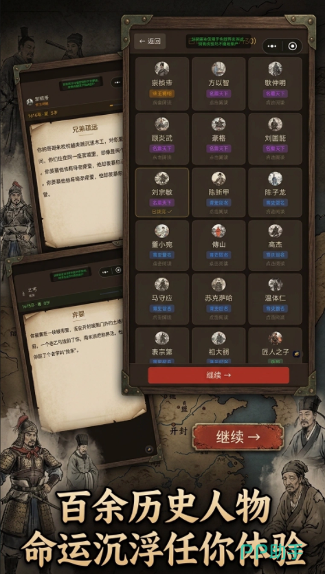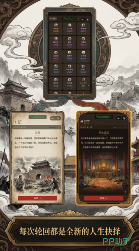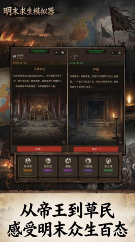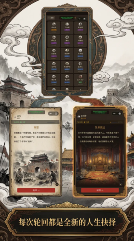 整个游戏相当于一本小说,会分成大量不同的角色,需要分别带领每一个角色体验同一时期的社会动荡,上百种不同的人生可以让玩家体验,为了方便玩家做出时间区分,角色会分成春夏秋冬四个界面,可以更直观的在每个季节和年龄中,了解角色的成长经历,对于历史设定感兴趣的成员,可以进入游戏,利用简单的文字陈述解读每个角色的命运,了解角色的人生重大转折点,大量的真实历史元素融入,非常适合玩家在游戏里学习历史知识。