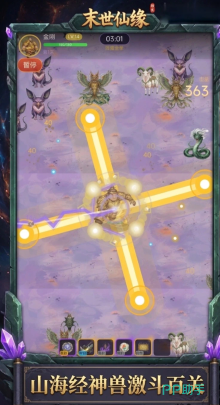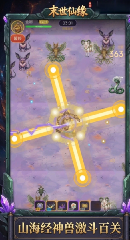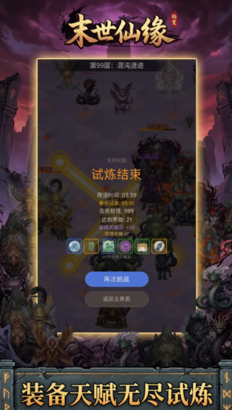 末世仙缘融合了传统修仙和肉鸽元素,在挑战过程中还会结合搜打撤玩法,挑战开启之后,玩家可以在八大修仙角色中做出选择,每个角色都会有不同的能力特性,选择完角色之后可以去挑选对应技能,每个技能在游戏里释放的特效不同,能产生的伤害数值和被动效果会有所变化,玩家需要在对战过程中不断调整,确保角色可以打出更高伤害,关卡会限定特定的倒计时,玩家要争取在倒计时之内,消灭更多山海经怪物,