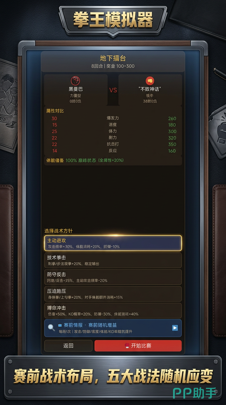 擂台比赛正式打响之际,玩家还可以提前在赛前进行战术布局,当前给大家提供了主动进攻、技术拳击、防守反击、压迫施压、搏命冲击等物种不同的战法,大家可以根据自己在赛中据对的不同情况来选择合适的战术方针,比如说想要主动进攻,那大家在选择了主动进攻以后,自身的攻击频率会增加30%,体能销毁会增加20%,自身的防御力则会下降10%等等,每一种战法都会产生相对应的输出能力。