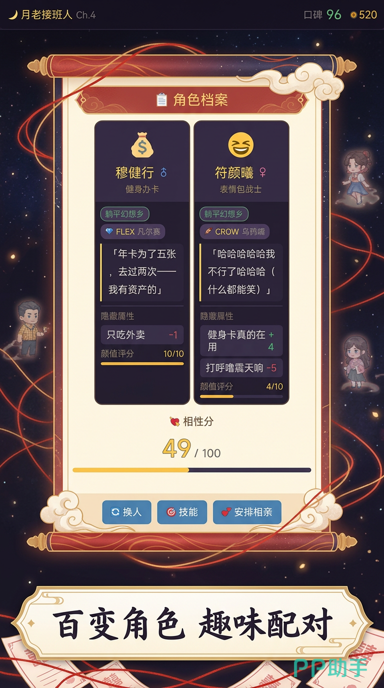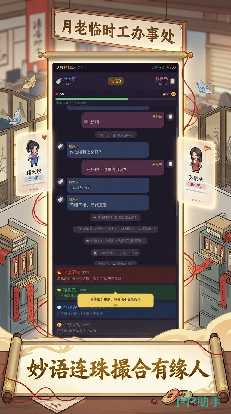 好多朋友都在找月老接班人手游下载的相关信息,毕竟这游戏的设定实在太戳人了,谁能拒绝当一把管姻缘的小神仙,把那些不想谈恋爱的家伙都撮合成一对呢?之前不少人吐槽,现在的恋爱游戏不是自己当主角谈恋爱,就是搞什么虐心剧情,玩多了都腻味。这个倒好,直接让你当月老,管别人的姻缘,主打一个看热闹不嫌事大,还能把那些摆烂的单身都给安排明白,光想想就觉得有意思。