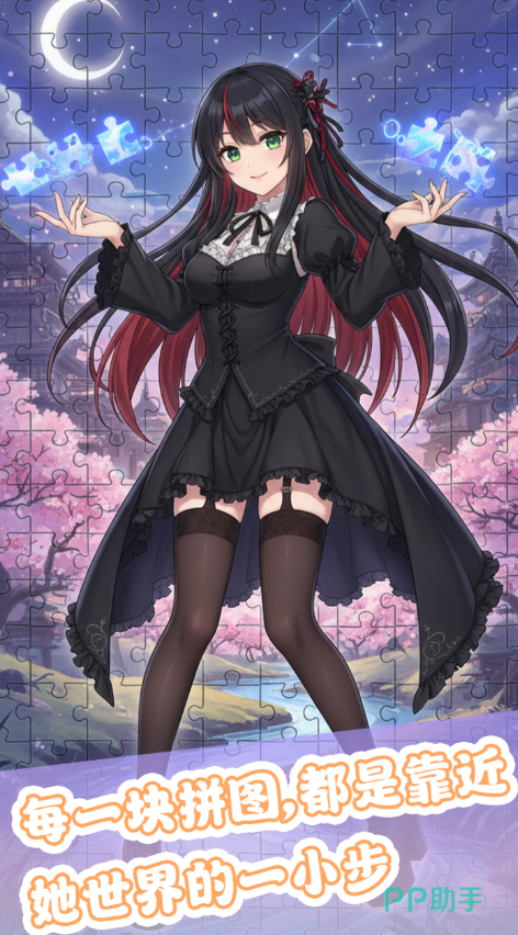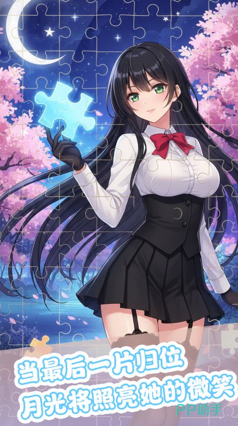 每关设有明确时限,超时即判定失败,进一步考验反应速度与策略规划能力。为平衡难度曲线,游戏内置多类功能道具:定位辅助型道具可高亮下一正确拼接位;时间延展型道具可增加倒计时余量;玩家可根据当前通关状态自主选择是否启用。所有关卡主角均以原创二次元美少女形象呈现,角色立绘风格统一、细节丰富,支持玩家自定义挑战角色,增强沉浸感与个性化体验。