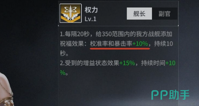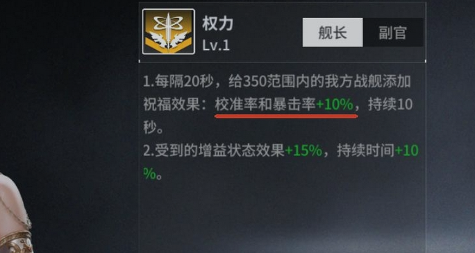 从基础的属性上来看,它的核心主要是以预判,还有专注为主。面板的设计就会贴合辅助定位,并且还会有降低主动伤害承受以及提升暴击抗性的特性。有生存能力,也有辅助的优势,并不需要选择去堆输出的属性,在战场上照样也可以成功的站稳脚跟。技能机制也是它的核心优势,可以每相隔20秒触发一次覆盖半径350范围内的战舰,提供持续10秒的校准率,还有暴击率加成。1级技能会有10%的基础加成,满级之后就可以提升到25%。