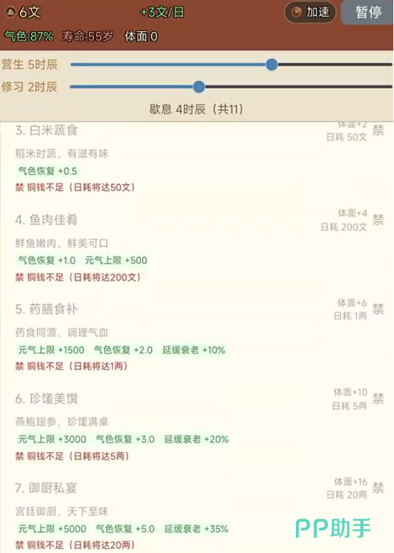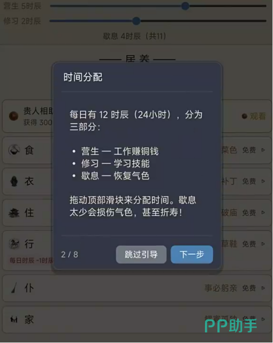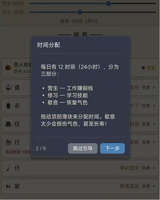 有可能会让大家从刚开始的乞丐,在逐渐成长到朝廷当中,每次的选择都会步步为营。可以通过营生或者是休息等多种方式来成长,历练自己的人生经历。而且还能够亲自体验在曾经的大明王朝时的衣食住行,每一个选择都是自己的修行之路,在屏幕最下方也会看到多种选项,包括居养或者是陈旧等等。