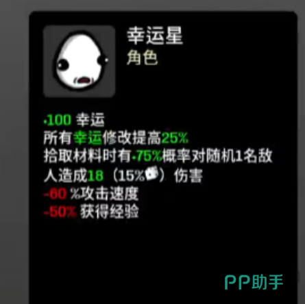 另外护身符和紫装也不需要过分的单休,因为在后期商店多刷新几次,大概率就能够刷出来,实在遇不到的话,玩家这时候多打两局就能够收集。一旦玩家成功的解锁幸运星之后,就需要合理的运用它,而它的属性设计完全围绕幸运进行展开,由于它自带100点幸运,所以幸运。效果提升25%拾取材料时还有75%的概率对随机敌人造成一定的伤害。因此它的清怪效率比较高。