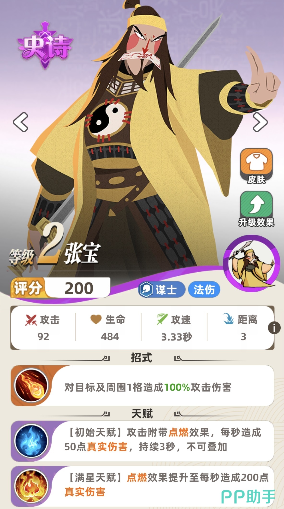 张宝的核心天赋为“烈焰烙印”:每次普攻可对目标施加点燃效果,被点燃单位每秒承受固定数值的真实伤害;该效果随技能等级提升而增强,满级后支持多层叠加。这意味着在持久战中,仅靠持续挂点燃即可形成稳定、不可减免的输出节奏,尤其适配高频率出手或延长战斗时长的战术体系。因此,判断张宝是否值得首发,并非取决于稀有度标签,而应聚焦于其在特定阵容中的功能性不可替代性。