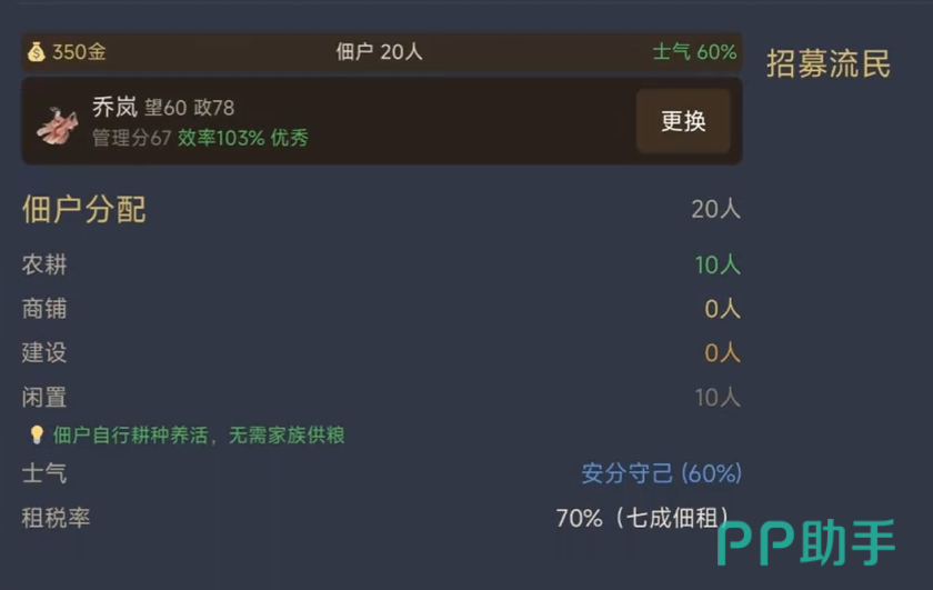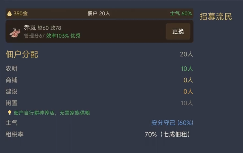家族治理是本作核心玩法之一。每位族人具备差异化属性与专精方向:擅长农事者可委任至屯田司,提升粮食产出效率;精于交际者宜派往招贤馆,降低门客招募成本并提高成功率;体魄强健者则适合编入校场,加速部队训练进度与战力成型。通过科学分工与动态调配,实现人尽其才、物尽其用,方能在群雄割据的汉末乱世中稳步崛起。