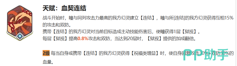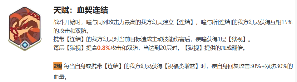 瞳的核心玩法,就是她的天赋血契连结。战斗一开始,她会自动和同列攻击最高的队友,建立连结关系。这个连结不是随便选的,所以组队的时候,要注意站位。连结之后,两个人都能获得15%的攻击和双防加成,听起来不算特别多,但这只是开始。真正厉害的地方在于,狱视这个状态,每当连结的队友,用主动技能打伤害,瞳就会叠加一层狱视。每层狱视提供0.8%的攻击和双防,看起来很少对吧,但是能叠20层。叠满之后,加成会直接翻倍,算下来就是32%的全属性提升,这个数值就很可观了。