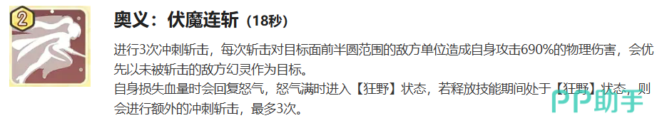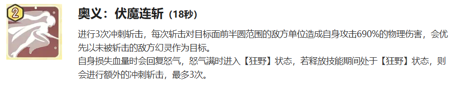 奥义伏魔连斩的冷却时间是18秒,会进行3次冲刺斩击。每次斩击对目标前方半圆范围的敌人,造成690%攻击的物理伤害,而且会优先选择还没被砍过的敌人。这个技能的特点是,瞳损失血量时会回复怒气,怒气满了就进入狂野状态。如果释放技能时,处于狂野状态,还会额外进行最多3次冲刺斩击。也就是说狂野状态下,这个技能最多能砍6次,伤害爆发非常恐怖。