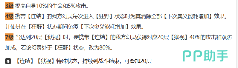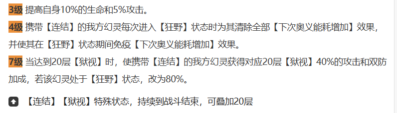 7级天赋是整个连结体系的升华。当瞳叠满20层狱视之后,连结的队友也能获得对应的加成,是狱视提供加成的40%。如果队友处于狂野状态,这个比例会提升到80%。这意味着瞳不仅自己变强了,还能让队友也跟着变强,这种双向增幅的设计,让她在队伍中的价值非常高。