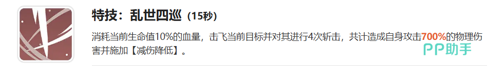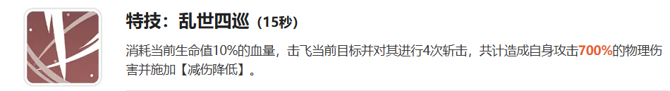 特技乱世四巡冷却15秒,需要消耗当前生命值10%的血量。会击飞当前目标,并进行4次斩击,总共造成700%攻击的物理伤害,还会给目标施加减伤降低的debuff。虽然要扣血,但是配合瞳的回血机制,这点消耗完全可以接受。而且减伤降低这个debuff,能让后续的伤害更高,在打boss的时候,很有用。