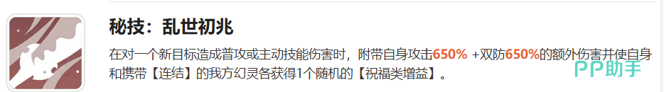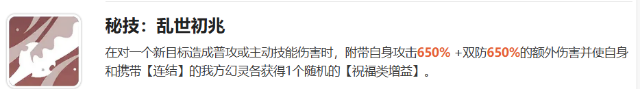 秘技乱世初兆是一个被动技能。每次对新目标造成普攻,或主动技能伤害时,会附带650%攻击,加650%双防的额外伤害,同时让瞳和连结的队友,各获得一个随机的祝福类增益。这个技能,配合前面说的2级天赋回血机制,能让瞳在战斗中保持很好的状态。而且这个额外伤害的倍率很高,打新目标的时候伤害,会特别爆炸。