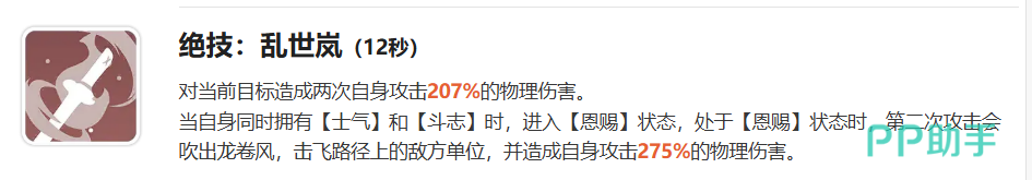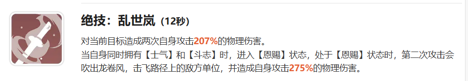 绝技乱世岚冷却12秒,对当前目标造成,两次207%攻击的物理伤害。当瞳同时拥有士气和斗志这两个状态时,会进入恩赐状态。在恩赐状态下,第二次攻击会变成龙卷风,能击飞路径上的敌人,并造成275%攻击的物理伤害。这个技能的控制效果,在某些情况下很有用,可以打断敌人的技能释放。