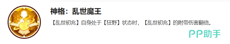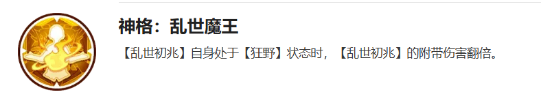 神格乱世魔王,强化了秘技乱世初兆。当瞳处于狂野状态时,乱世初兆的附带伤害会翻倍。原本就已经很高的伤害直接变成两倍,这让瞳在狂野状态下的爆发能力达到了一个新的高度。配合奥义在狂野状态下的额外斩击,整体输出能力非常夸张。