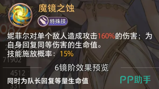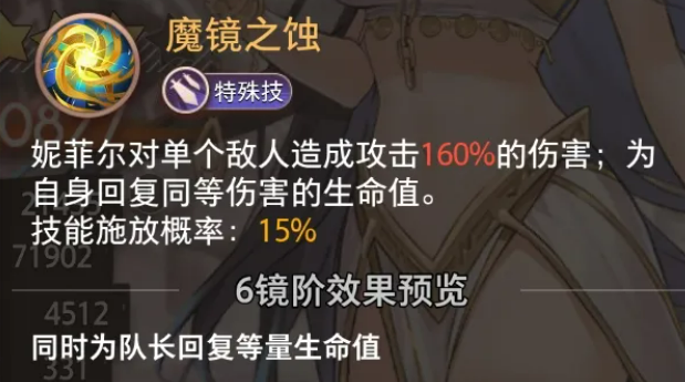 特殊技能叫做魔镜之蚀,这个技能是对单个敌人造成160%伤害,然后回复等量的生命值。如果升到6阶的话,还能同时给队长回复生命。这个技能兼顾了输出和治疗两个方面,可以说是一个比较全面的技能。在战斗中,既能对敌人造成伤害,又能给自己或者队友回血,一举两得。这种吸血类型的技能,在很多情况下都挺好用的。