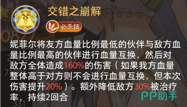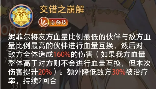 然后是她的必杀技,交错之崩解。这个技能的效果比较复杂,可以互换敌我双方血量最低,和最高的单位,同时对敌方全体造成160%的伤害,还能降低敌人30%的被治疗率。这个技能的互换机制,是它最大的特色,可以在战斗中,制造出一些意想不到的局面。比如把敌方的高血量坦克,和己方的残血队友互换,瞬间改变战局。降低治疗率的效果也很实用,可以削弱敌方的回复能力。