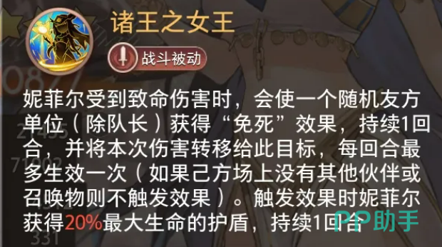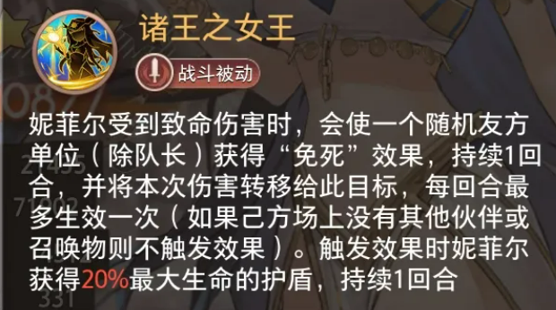 先说说她的被动技能,叫做诸王之女王。这个技能的效果是,当妮菲尔受到致命伤害的时候,会把伤害转移给队伍里面,随机一个队友,然后自己获得一个护盾,护盾的量是她最大生命值的20%。这个技能,每回合可以触发一次,算是一个保命机制。在主要时刻,能够帮助妮菲尔躲过致命一击,让她能够继续留在场上战斗。这个被动技能的设计理念,就是让妮菲尔更加持久,不容易被秒杀。
