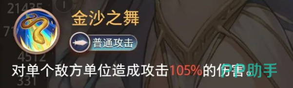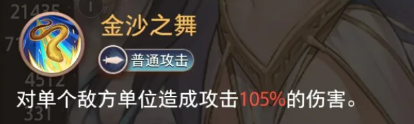 普通攻击叫做金沙之舞,对单个敌人造成105%伤害。这是妮菲尔的基础输出技能,虽然没有什么特殊效果,但是作为普通攻击来说,也算是正常水平。在没有释放其他技能的回合,就可以用这个普攻,来进行基础输出。