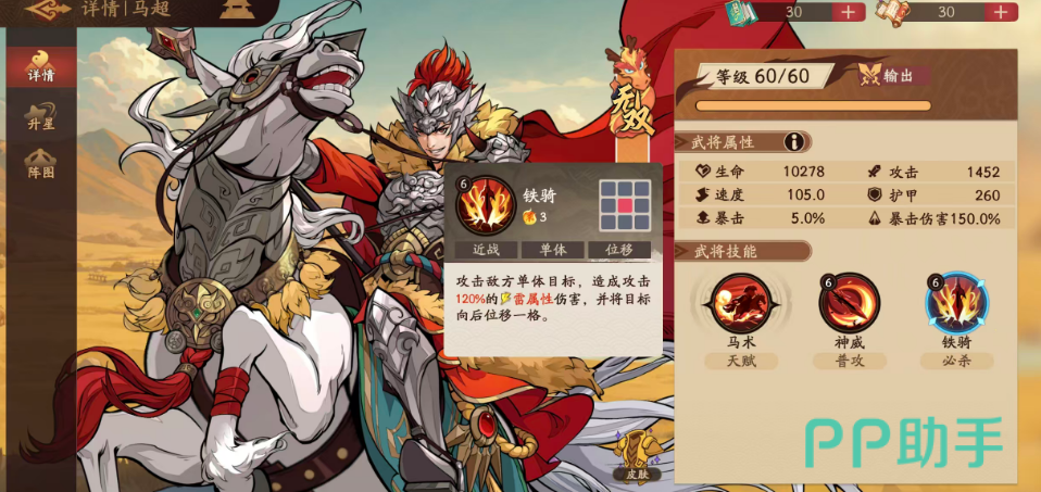 最后就是在6命的期间只要是之前锁定的劲敌死亡下场,那么这里马超就可以触发行动提前50%的效果,行动提前其实是挺管用的,但是这个能力一般一个回合的时候只能触发一次,所以大家要抓紧这一次行动提前的机会,除了这个效果一步步增强的天赋之外,他还有一个铁骑的能力在上面是可以攻击敌方单体的目标,在上面只要是针对敌人进行输出,都是有一个单体的输出会针对敌人九宫格中间的位置,对这个位置上面的敌人进行攻击的时候是会造成120%的雷属性伤害,且在上面还可以通过控制位移的效果让这个位置上面的敌人往后退一格,所以用来改换敌人位置也是可以用他的必杀技的,利用这个能力其实大家也可以将马超的天赋用的更好,这样将中间一排的敌人位移到最后一排去之后,我方的角色再对最后一排的敌人进行攻击,就可以得到比之前多5%的输出啦。
