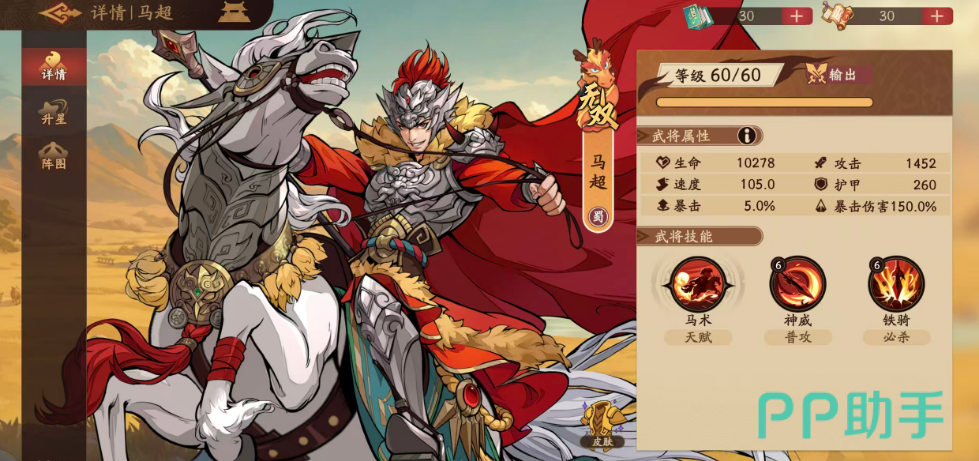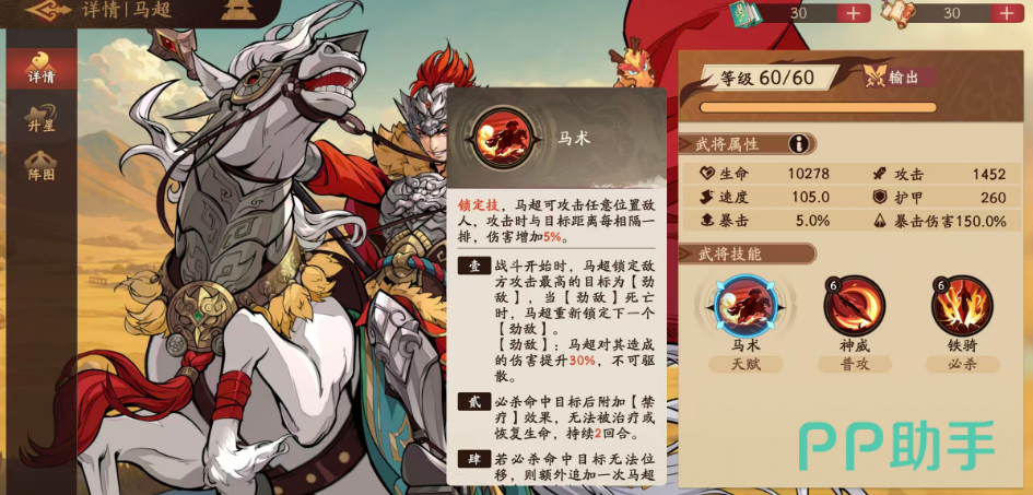 想要这个天赋更好用,升星是必不可少的,而在天赋达到1星的情况下,这里只要是战斗开始,那么马超就会锁定敌方攻击数值最高的一个对手作为自己的劲敌,然后针对这个敌人进行攻击,只要这个劲敌死亡下场,马超才会更换下一个输出最高的角色作为他的劲敌,而这里的劲敌的效果就是会让马超针对他进行攻击的时候,有30%左右的输出提升,且这个能力是不可以被敌人给驱散的,所以被他锁定的敌人一般在其中是无法逃脱这个效果的,而在达到2命的情况下,这里只要是马超使用自己的必杀技,且击中敌人的时候,在上面就可以附加禁疗效果给敌人,那么敌方的这个目标此时就是无法被治疗或者是恢复生命的,另外4命的时候如果使用必杀技正好命中敌人的话,他就无法进行位移,此时还可以额外追加一次马超在攻击上面30%的伤害。