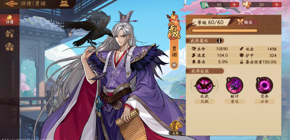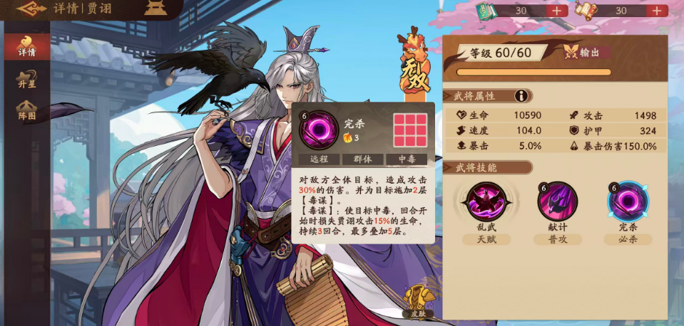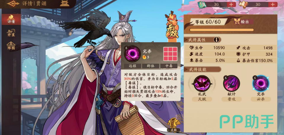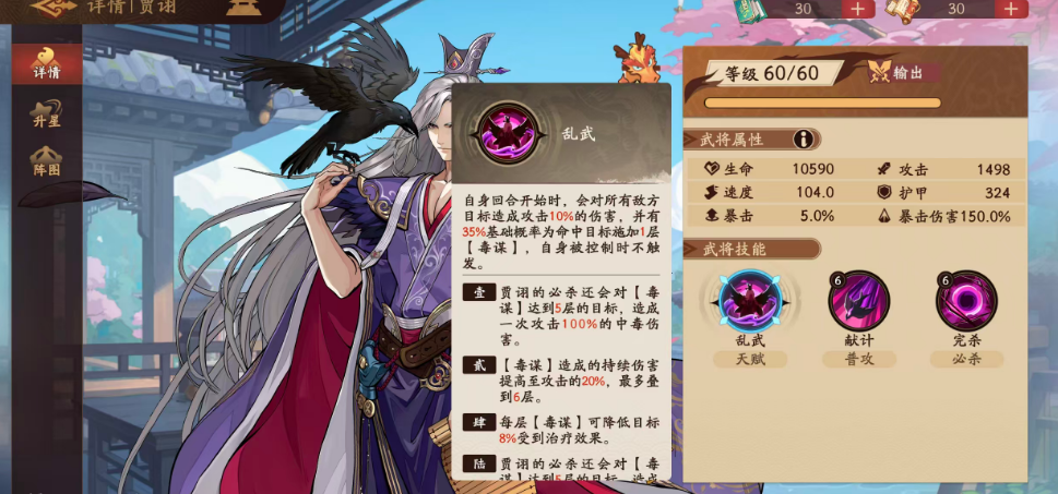 游戏中的贾诩如果是遇到对面有能够驱散负面能力的武将,那大家就有很大的胜利概率了,这里他的天赋是乱武,通过这个技能他可以在上面自身回合一开始行动时,就对所有敌方目标造成攻击当中10%的伤害,且这里是有35%的概率会在这样的伤害当中施加给敌人一些控制,也就是这里的毒谋状态,就属于是一类控制效果,虽然只能叠加一层,但是控制敌人的效果还是比较明显的,这里毒谋在贾诩自身是处于被控制状态的时候其实是不触的,但是如果是成功施加给敌人的话,在上面可以使敌人中毒,且在回合一开始的时候就损失贾诩攻击上面15%的生命数值,在持续3个回合之后,大家是最多可以叠加到5层的。