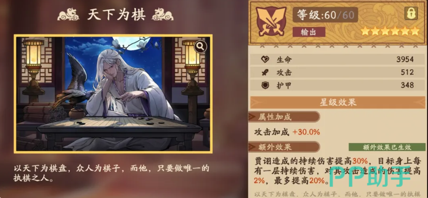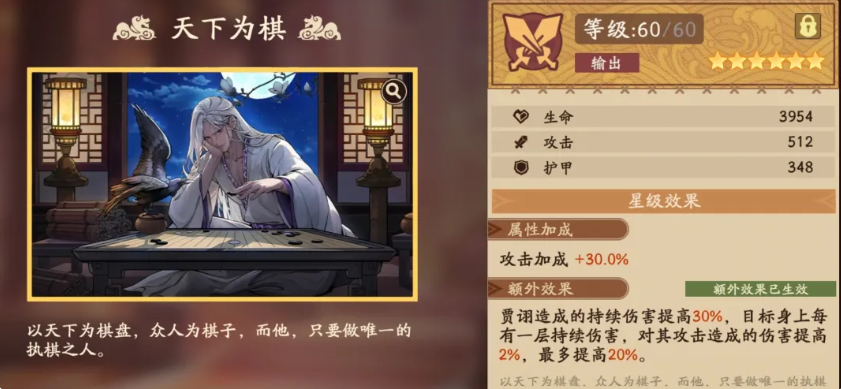 而在贾诩完杀的这个必杀技效果当中,大家可以看到他一个全体的攻击效果,用这个必杀技他是可以队敌人群体进行输出,造成30%的伤害数值之后直接施加2层毒谋到敌人身上,所以大家不要看这个技能的输出数值比较小,实际上他加上了3个回合的毒谋影响时,敌人每一个回合里面掉的血量就不少了,而且他也可以通过其他专武以及锦囊的搭配来增强这里毒元素的攻击,如果大家给他搭配专武溯影,这里简体大家可以考虑的就是天下为棋,这是最适合为他带来更多持续伤害的,且在上面基础的攻击属性加成都有很高的数值,后期贾诩造成的持续伤害加成也可以提升30%的数值,如果是敌人身上每有一层持续伤害的话,在这里大家还可以对敌人的攻击造成更多的提升。