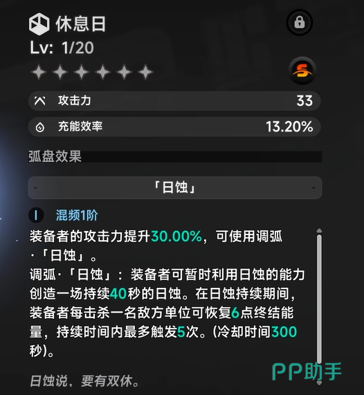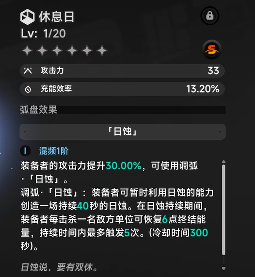 休息日这把弧盘的基础属性,还算不错,1级的时候,攻击力有33点,充能效率是13.20%。虽然看起来数值不算特别高,但是它的弧盘效果,才是真正厉害的地方。它的效果叫做日蚀,混频1阶的时候,就能给装备者提升30%的攻击力,这个提升幅度已经很可观了。更重要的是,它还有一个调弧技能,可以创造一场持续40秒的日蚀现象。