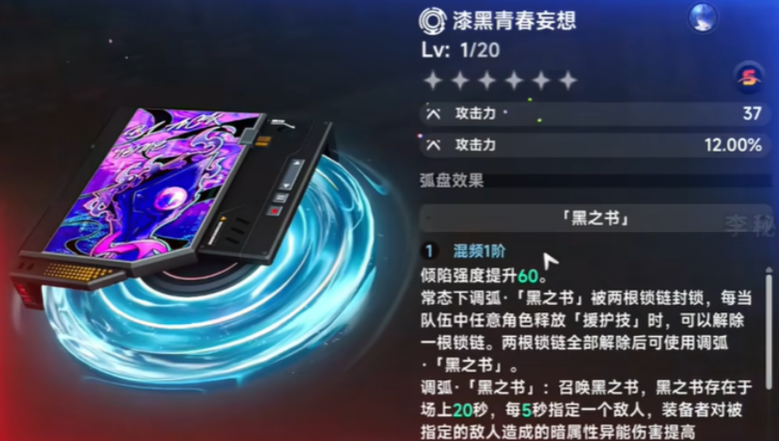 关于适配角色这块,漆黑青春妄想最合适的只有一个,就是达芙迪尔。她的整套技能体系就是围绕暗属性异能伤害和倾陷来运作的,这把弧盘的被动和调弧技能,几乎是为她量身打造的。倾陷强度加60,再加上黑之书对暗属性伤害的提升,还有倾陷触发时的额外打击,这三个点全都精准地踩在了达芙迪尔的输出节点上。拿到这把弧盘又有达芙迪尔的玩家,基本上可以直接上手用,不太需要犹豫。
