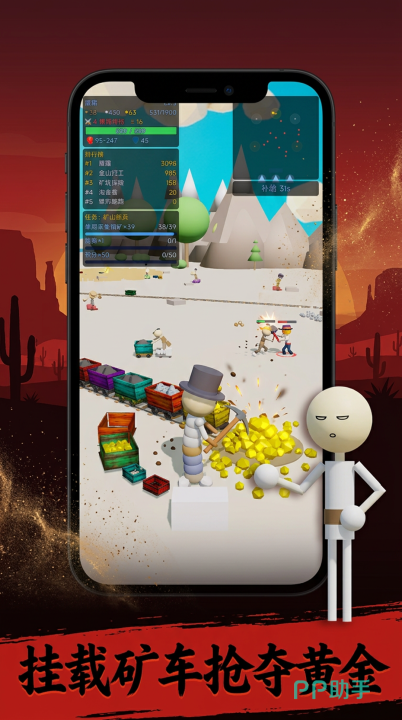 从玩法设计来看,《黄金大镖客》融合了轻度操作与强对抗性。其核心机制类似3D视角下的动态资源争夺战——玩家驾驶可装载黄金的矿车,在立体地形中灵活转向、加速冲刺,拾取散落于地图各处的黄金块。所有对局均为即时匹配,无需排队等待,支持随时加入战斗。