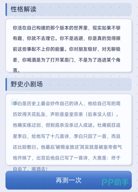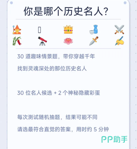 这是一款以历史人物为内核的心理测评类休闲手游,通过30道贴近日常情境的选择题,结合科学的性格建模逻辑,为玩家匹配最契合的历史人物形象。部分用户可能误以为测试结果纯属趣味玄学,实则其底层采用多维度人格因子加权算法,融合MBTI基础模型与历史人物行为数据库进行交叉验证,确保结果具备心理学参考价值。