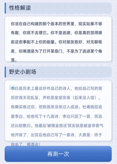 测试完成后,系统将输出三重反馈:一是匹配度最高的历史人物身份(目前已覆盖32位中外代表性人物);二是基于回答数据生成的个性化性格剖面图,涵盖决策风格、社交倾向、压力应对等维度;三是该历史人物在正史记载之外的冷知识延伸,增强文化纵深感。后续版本将持续扩充人物图谱与题库规模,优化算法精度。