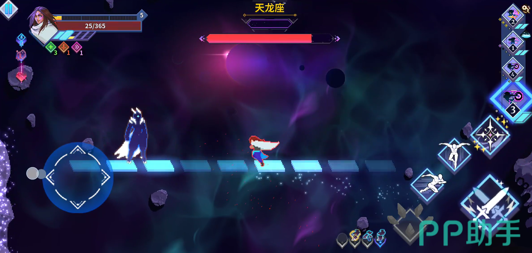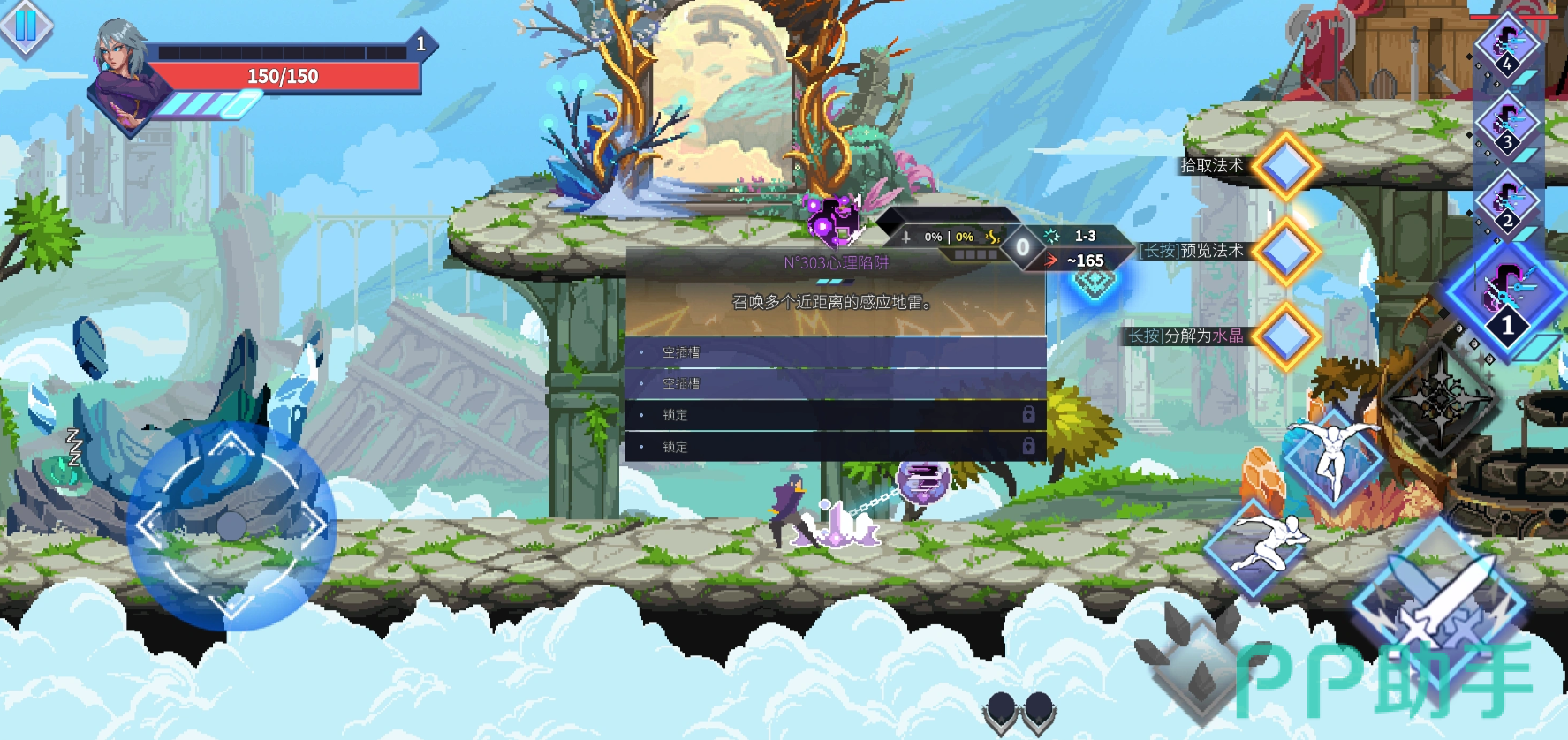 游戏提供宝石姐、双枪弟、拳哥等四位初始角色,每位角色拥有独立技能树、攻击逻辑与位移机制。玩家可自由搭配主动技能、被动天赋及道具效果,构建专属战斗流派。操作层面支持平A重置二段跳CD,由此衍生出空中冲刺、蹬墙跳跃、悬停追击等进阶技巧,显著提升战斗维度与操作上限。