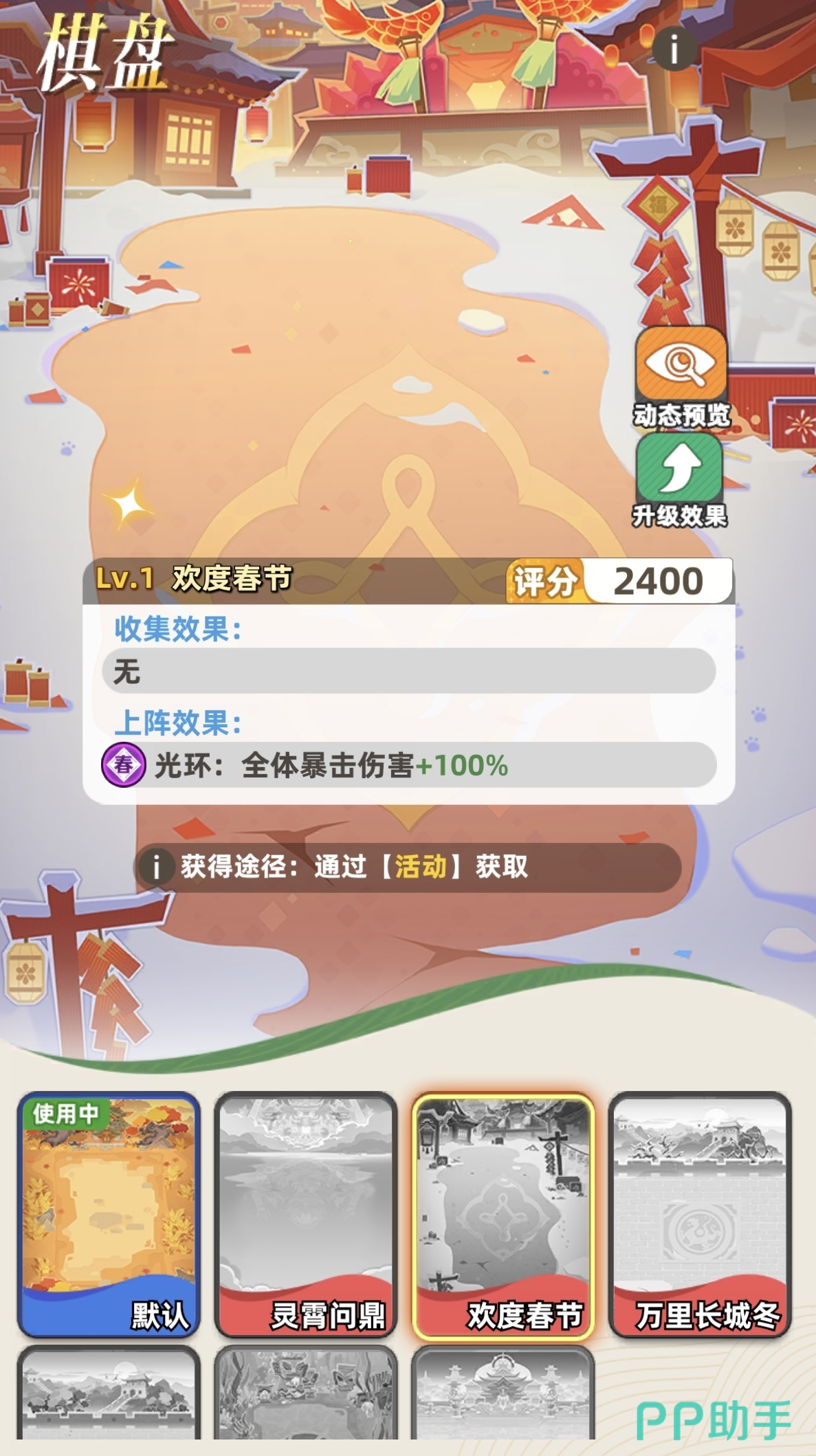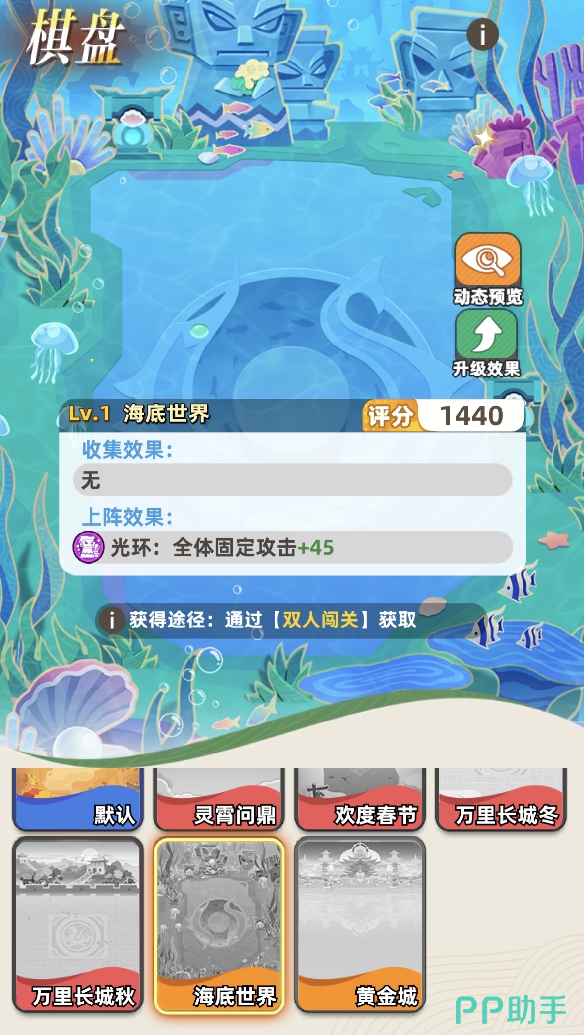 当前已上线的棋盘外观共六款,获取方式与效果各不相同: • 凌霄问鼎:赛季排行榜奖励,激活后全体单位攻击力+50; • 欢度春节:春节活动限时获取,上阵后全体暴击伤害提升100%; • 万里长城冬:试炼宝箱产出,收集效果为对战胜利后额外获得10星; • 万里长城秋:同属试炼宝箱获取,收集效果为体力恢复速度提升4%; • 海底世界:双人闯关活动通关奖励,上阵后全体固定+45点攻击力; • 黄金城:首充活动专属,收集效果为对战期间额外获得50%元宝。