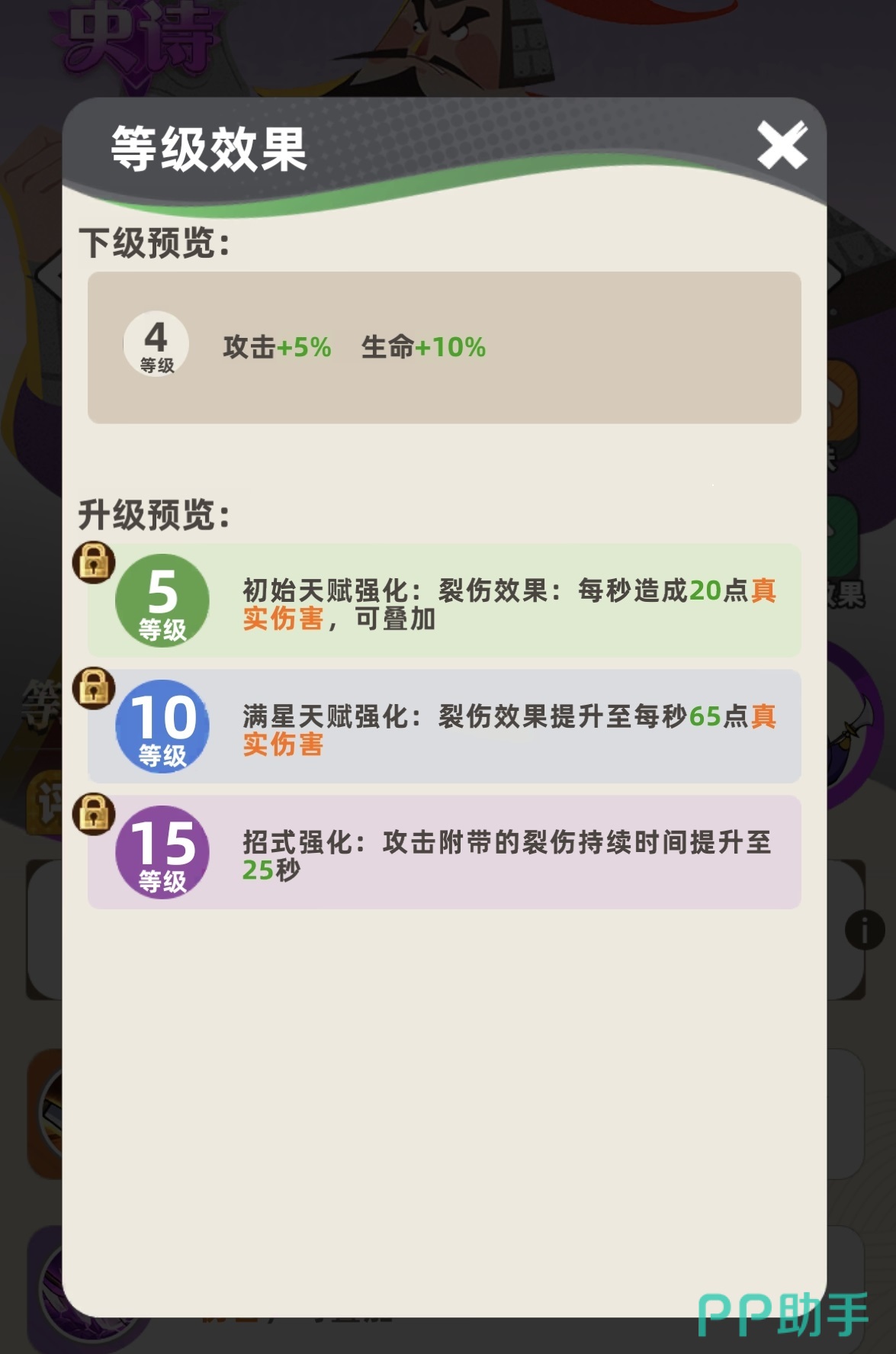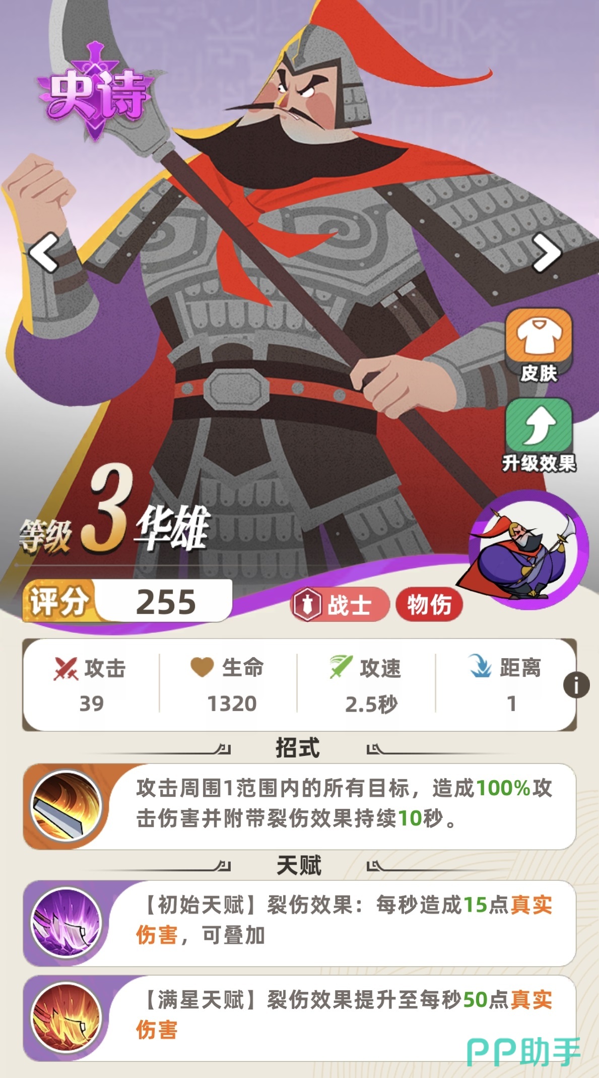 在等级成长方面,华雄的强化路径清晰明确。升至10级并达成满星后,裂伤状态的每秒真实伤害上限提升至65点;当等级达到15级时,单次攻击所附带的裂伤持续时间延长至25秒。这意味着高阶华雄在长时间作战中能持续构建高额真实伤害池,但需注意其优势释放存在时间阈值——通常需战斗进行至中后期才能充分显现。因此,该英雄对阵容整体生存能力、续航保障及协同输出节奏提出较高要求,推荐搭配具备稳定承伤、持续回血或延控能力的队友。