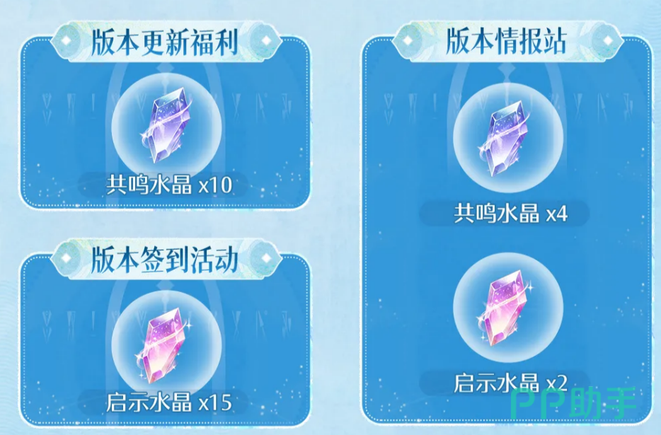 版本更新本身,也带了一波奖励,更新当天,可以领到共鸣水晶10个。版本情报站那边,还有共鸣水晶4个加启示水晶2个,这部分,基本上进去看一遍就能领,操作上没什么门槛。另外版本签到活动,会陆续发放启示水晶,累计下来有15个,每天上线打一下卡就行,不需要完成什么复杂的任务。
