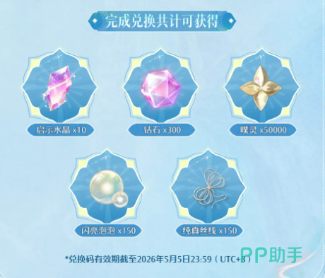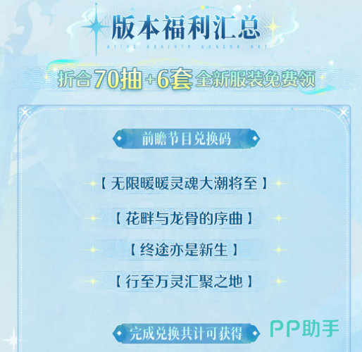 先说兑换码这块。前瞻节目一共放出了四个,分别是【无限暖暖灵魂大潮将至】、【花畔与龙骨的序曲】、【终途亦是新生】,还有【行至万灵汇聚之地】。把这四个全部兑换完,可以拿到启示水晶10个、钻石300颗、噗灵50000点、闪亮泡泡150个、纯真丝线150根。量不算特别多,不过白给的,总归不亏。要注意这批兑换码有截止时间,到2026年5月5日晚上11点59分(UTC+8)就过期了,记得提前去兑换,别拖过期了。
